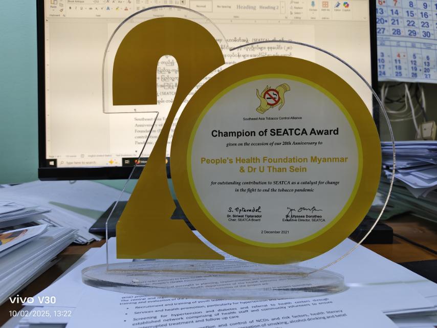 Southeast Asia Tobacco Control Alliance (SEATCA) has given, on the occasion of the 20th Anniversary of SEATCA, the “Champion of SEATCA Award”, to the People’s Health Foundation (PHF), Myanmar and Dr U Than Sein (President of PHF) for outstanding contribution to SEATCA, as a catalyst for change in the fight to end the Tobacco Pandemic, on 2 December 2021.